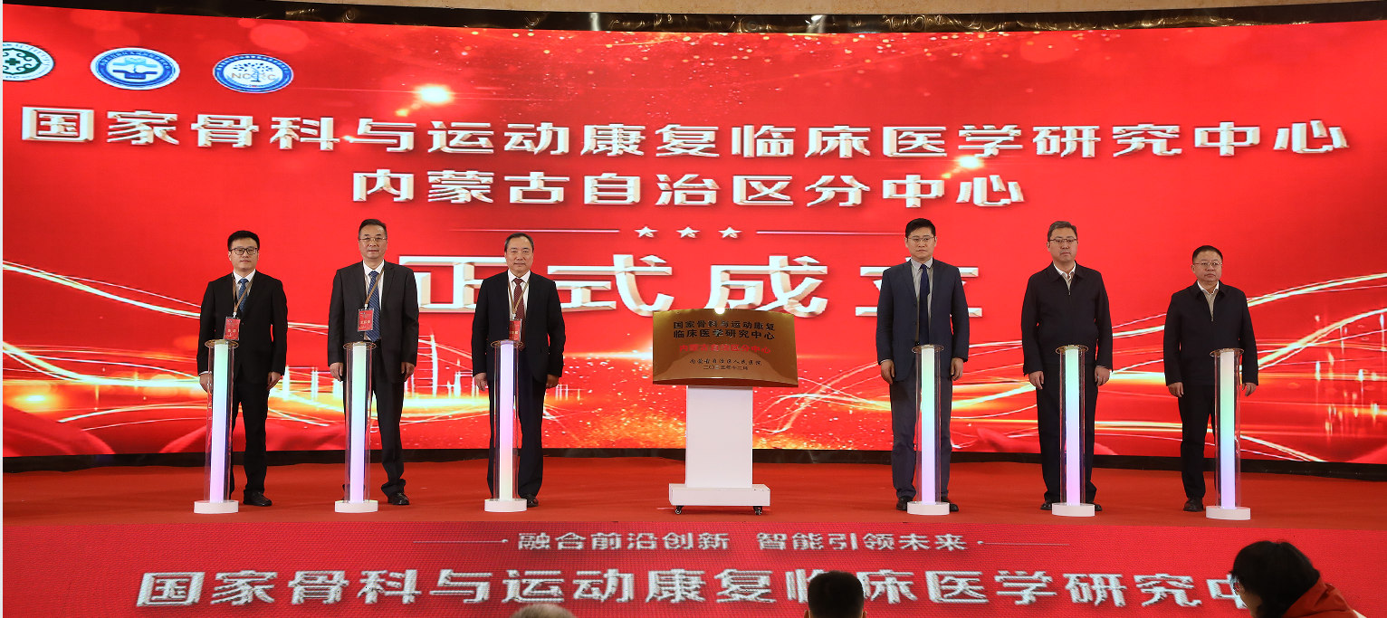 唐佩福院士、刘勇主任、徐斌副厅长、王松俊主任、侯煜院长、张浩主任共同为国家骨科与运动康复临床医学研究中心内蒙古自治区分中心成立揭牌。