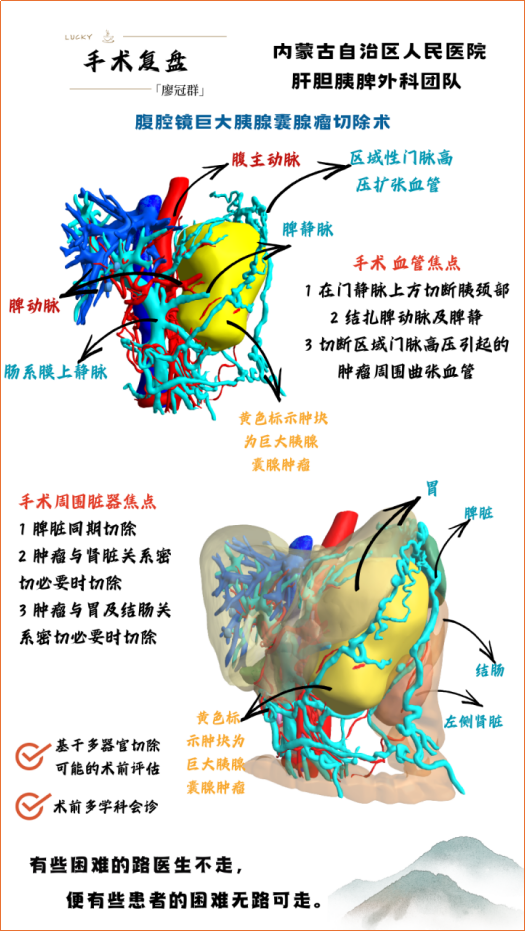 胰腺粘液性囊腺瘤是较为常见的胰腺囊性肿瘤,好发于胰腺体尾部,治疗上应优先考虑既能彻底切除病灶,又能最大限度保留胰腺功能及胰周器官的微创手术方式。相较于传统手术模式,内蒙古医院肝胆胰外科团队采用腹腔镜手术方式,对于如此巨大的胰腺肿瘤成功实施腹腔镜手术切除在国内也少有报道,采用腹腔镜手术将传统可能采用30多公分手术切口缩短为几公分,通过高清摄像机的放大视野,操作更加精细,并且明显减少腹腔内脏器的扰动,具有恢复快、创伤小等优势。并且通过快速康复模式,患者第二天就开始进食流质食物。