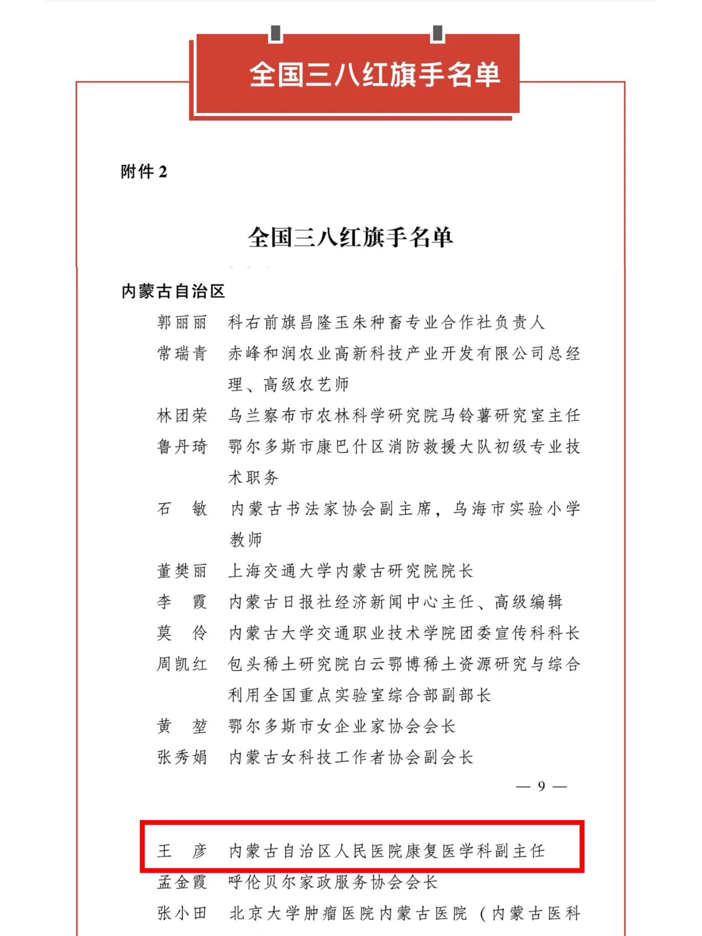 近日,全国妇联正式公布 2025 年度全国三八红旗手标兵、全国三八红旗手、全国三八红旗集体及全国巾帼文明岗名单。内蒙古自治区人民医院康复医学科副主任王彦荣获 "全国三八红旗手" 称号。