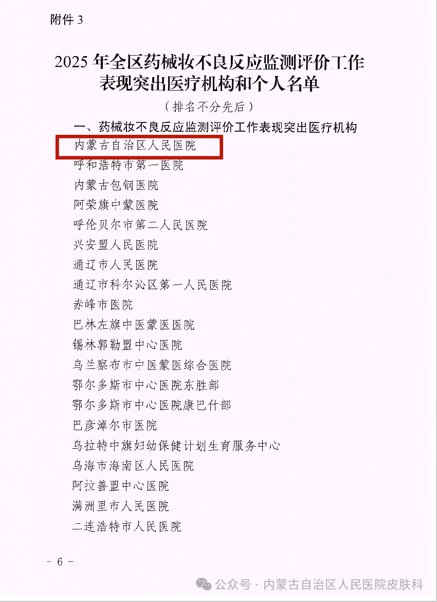 近日,内蒙古自治区药品审评和药物警戒中心发布《关于表扬2025年全区药械妆不良反应监测评价工作表现突出单位的通报》,内蒙古自治区人民医院获评“2025年全区药械妆不良反应监测评价工作表现突出医疗机构”,医院皮肤性病科凭借专业优势与扎实履职,成为此项工作的核心力量。
