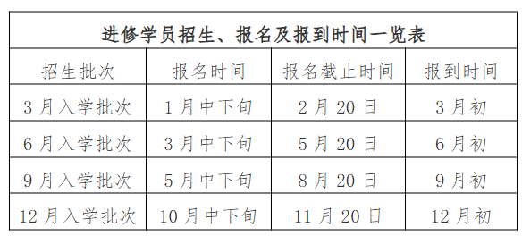 (二)每年招生4批次,分别于3月、6月、9月、12月初报到,具体时间另行通知,进修时长要求3个月、6个月、12个月。